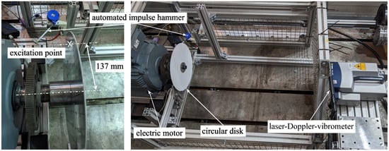 Preliminary investigations by Schmidt [] revealed that a measurement setup consisting of an automated impulse hammer for excitation and an LDV for measuring the structural vibrations is most suitable for the underlying measurement problem. The impact force of the impulse hammer is measured with a piezoelectric force sensor at the hammer’s tip. Figure 10 shows the experimental setup together with the utilized rotor dynamics test bench. The circular disk is mounted on an electric motor via a flange with a diameter of 61 . The rotational speed of the motor can be adjusted via a frequency converter. The disk is excited with the automated impulse hammer on the side of the disk facing the motor. The automation of the impulse hammer enables a reproducible and remotely controllable excitation. The surface velocities of the disk are measured using an LDV (Polytec PSV-300-H, Germany-76337 Waldbronn). To realize a diffuse reflection behavior, the circular disk is sprayed with chalk spray, which enhances the signal quality.