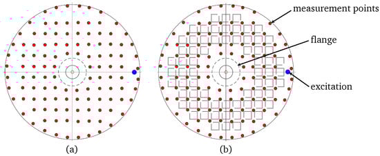 The circular disks as shown in Figure 9 are firstly investigated in the non-rotating state using the experimental setup described in Figure 10 to validate the functionality of the VAMM. For this purpose, the circular disks with and without the VAMM are excited with the automatic impact hammer at a radial distance of 137 mm from the center of the disk. The surface velocities are measured at 116 points each according to Figure 11. The measurement points are positioned in such a way that they are situated in between the resonators.