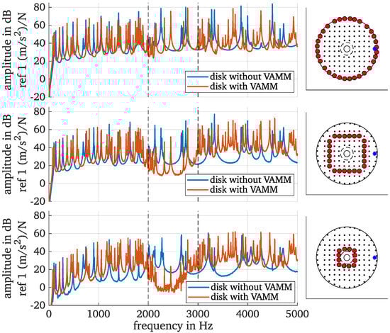 Averaged transfer functions (accelerance) for the outer (top), middle (middle) and inner measurement points (bottom), both for a disk with VAMM and without. Sketch of the disks: Red: Evaluated measurement points. Blue: Excitation point.