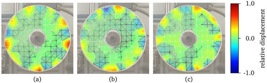 When measuring structural vibrations in simple disk structures using a rotating measurement system at high rotational speeds, gyroscopic effects, centrifugal forces, and shear forces influence the vibration behavior [,]. Specifically, centrifugal or centripetal forces result in a stiffening of the structure, leading to an increase in natural frequencies.