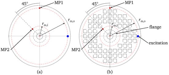 To characterize the circular disks in the rotating state, measurements are conducted at two measurement points with radial distances of = 49 and = 137 (see Figure 14). These radii were chosen to ensure that the measurement points are not interrupted by the slots of the resonators during the rotation of the disk. Measurement point 2 (MP2) is rotated by relative to measurement point 1 (MP1). This is because at this point, a minimum in measurement noise was present. This is likely due to a non-perfect concentric and orthogonal alignment of the LDV with respect to the axis of rotation of the circular disk. Since the measurements are comparative between the circular disk with and without VAMM, the chosen arrangement of the measurement points does not impose any restriction on the significance of the results. The experimental setup developed in Section 3.1 is used for the measurement.
