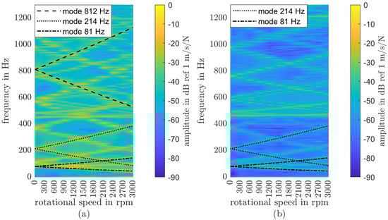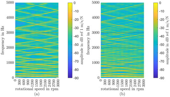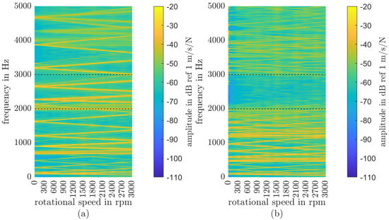 Figure 15 shows the results of the measurements at measurement point 1 ( = 137 ) as a Campbell plot. Here, the transfer function in terms of admittance is plotted over the rotational speed and the frequency. Clearly visible is the phenomenon of splitting modes, known from Section 1.1.2, that occurs with increasing rotational speed. As expected from measurements in the non-rotating system, no reduction in amplitude occurs within the stop band frequency range, which is indicated by dashed lines at 2000 and 3000 . The underlying frequency response functions of the Campbell plot can be seen for every step in rotational speed in Figure A1 of the Appendix A.