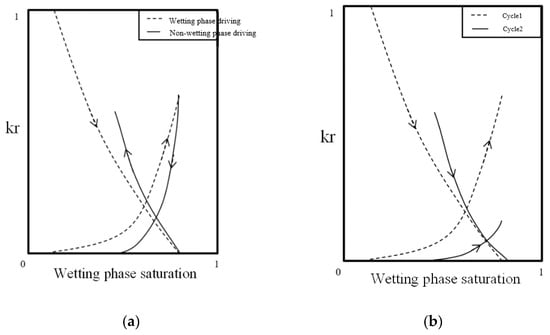 There are two types of relative permeability [7,15] hysteresis, as shown in Figure 1: displacement-direction-dependent and saturation-history-dependent hysteresis [12,14,16]. Displacement direction-dependent hysteresis refers to the difference between drainage and imbibition permeability curve. Saturation-history-dependent means that the relative permeability curves of different cycles of continuous displacement in the same phase are different.