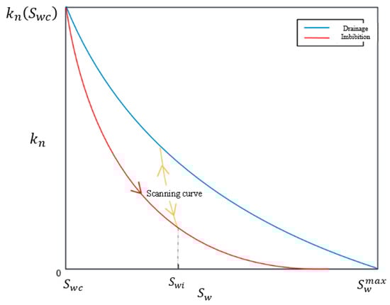 In all models of relative permeability hysteresis, the scanning curves are very important. As shown in Figure 2, assuming the minimum water saturation is and water injection begins, then should follow the imbibition curve until the water saturation reaches its maximum value . If, after reaching the maximum value , drainage begins, will follow the drainage curve until . If the drainage process is interrupted before reaching and water injection starts again, now needs to stop following the drainage curve and instead follow the imbibition curve. However, the imbibition and drainage curves almost never intersect at any point, so to make the transition from one point to another smooth, we need a transitional curve that starts from that point to another relative permeability curve. These transitional curves are called scanning curves [17,18]. Similarly, during the imbibition process, a transition can be made to the drainage process from any point, generally the drainage curve and imbibition curve, also called boundary curves or relative permeability envelopes.