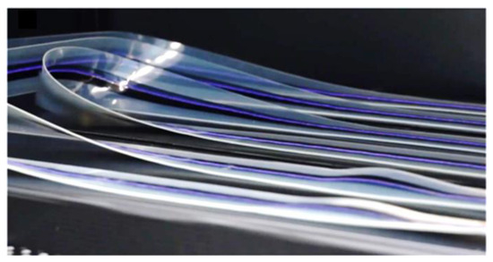 In recent years, techniques for preventing boundary layer separation [1] and reducing frictional drag [2] on wings have attracted considerable attention because of the increasing interest in resource efficiency resulting from climate-related issues and the rapid depletion of energy resources. These techniques need to improve the system efficiency of fluid machinery and reduce failures to extend their life. Conventional devices such as flaps and vortex generators are commonly applied to wings. However, the former is often a large and complex mechanical system with high energy consumption; therefore, it can only be applied to a limited variety of wings because of the high manufacturing costs and large size. The latter suffers from a constant increase in drag caused by passively enhanced turbulence. Recently, dielectric barrier discharge plasma actuators (DBD-PAs) were proposed as an alternative to the devices used for fluid control [3,4,5,6,7]. Figure 1 shows our DBD-PA electrode. Among the various active flow control technologies, DBD-PAs can be employed for practical use because they do not have any moving elements and can induce the relatively large momentum of airflow required for flow control [8,9,10,11]. In addition, these devices are lightweight, compact, highly responsive, and easy to install.