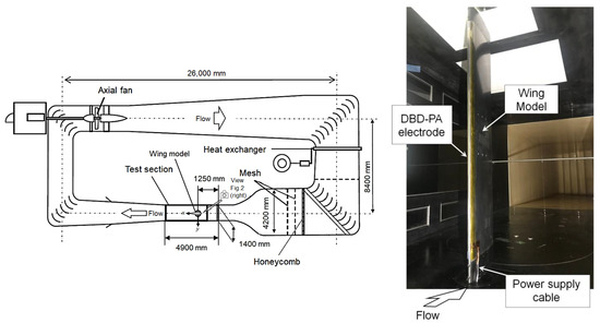 Suzen and Huzng’s simplified equation model [41] is used for simulating the plasma effect in the numerical analysis of the flow control effect of a DBD-PA on the flow around a wing. This model is quasi-steady, does not consider plasma generation, and depends on Poisson’s equation for the electric field vector and charge distribution. Therefore, the plasma effect on flow control does not include the effects of spatially distributed streamers or heat generation. Thus, it is difficult to quantitatively match the input energy to obtain the same fluid control effect as in the comparative experimental results. Furthermore, the results of the numerical analyses conducted in previous studies could be influenced by numerical boundary conditions because of the insufficient wingspan. Therefore, new experimental research is indispensable to clarify the flow control mechanism of plasma actuation and the actual effect of fluid control that can be obtained at a high Re number. A few experimental results under such high Re conditions exist [42,43,44,45,46,47,48,49]; however, they cannot sufficiently validate the fundamental investigations discussed earlier. Thus, although the flow control effect and mechanisms of the DBD-PA actuation for flow fields under high Re numbers have been suggested based on the results of numerical investigations, these suggestions need to be validated based on the phenomena observed in the experimental studies.