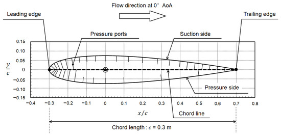 Wind tunnel testing was performed in a closed-circuit wind tunnel at the National Institute of Advanced Industrial Science and Technology in Japan. Figure 2 shows a schematic of the wind tunnel facility, coordinate axes, and a photograph of the wing model used in this experiment. This wind tunnel has a test section with a 1.4 × 1.4 m2 square cross-section. Furthermore, a two-dimensional NACA0015 wing model with a chord length of 0.3 m as shown in Figure 3 was used. The span length of the model, i.e., the model length in the z-direction, was 1.4 m. The aspect ratio and maximum blockage ratio of the airfoil model were 0.21 and 0.11, respectively. In this airfoil, the boundary layer near the leading edge transitioned from laminar to turbulent in the Re conditions in this study (105–106), and the position of the boundary layer separation and the stall angles changed gradually in this range of Re values. These stall characteristics resulted in various post-stall flow fields depending on the Re values. This airfoil is not commonly used for commercial wind turbine blades; however, it is appropriate for observing various flow fields in the experiments. Therefore, this airfoil was selected to investigate the flow control mechanism based on the assumption that the flow control effect depends on the flow field conditions rather than on the type of airfoil. The reference flow velocities in this experiment were 10, 22, 30, and 50 m/s, and the corresponding Re numbers were 1.9 × 105, 4.2 × 105, 5.7 × 105, and 9.4 × 105, respectively. The turbulence intensity of the freestream in the measurement section at velocities exceeding 10 m/s was less than 0.5%. The surface pressure on the wing model was measured using 38 pressure ports: 24 on the suction side and 14 on the pressure side, as illustrated in Figure 3. Table 1 lists the locations of the wall-pressure ports. The positions of all ports in the z-direction (i.e., the spanwise direction of the wing) were carefully designed to eliminate the effect of turbulence from the upstream ports. The ports positioned downstream were arranged further away from the center of the wind tunnel height (z = 0) in the positive z-direction on the suction side surface and in the negative z-direction on the pressure side surface. An AoA condition, which was the angle between the chord line and the mainstream, as shown in Figure 4, was in the range of 0° to 30°. The model was intermittently rotated around the z-axis to increase or decrease the AoA within the range quasi-statically; this motion is called the pitch sweep. The motion for increasing the AoA is called pitch-up and the motion for decreasing is called pitch-down. In this experiment, the distribution of the time-averaged surface pressure for each AoA was measured. The distributions of the pressure coefficient, , along the chord direction and lift coefficient, , for each AoA were calculated from the surface pressure. At 24°, the velocity field around the suction side of the wing model was observed using particle image velocimetry, and the flow pattern was subsequently investigated. One thousand pairs of particle images were acquired at repetition frequencies of up to 15 Hz. The time-averaged velocity fields were calculated from these images using a fast-Fourier-transform-based cross-correlation method. Under all conditions, the repetition frequency of the laser light was set out of synchronization with the burst frequency of the DBD-PA determined using and the reference flow velocity. Particles composed of dioctyl sebacate were generated using Raskin nozzles. The gaps between the wing model and both sidewalls of the wind tunnel were as small as possible, and no side fences were used. Therefore, the pressure and velocity fields were measured near the center of the wing model in the span direction to avoid interference from the boundary layer on the sidewall.