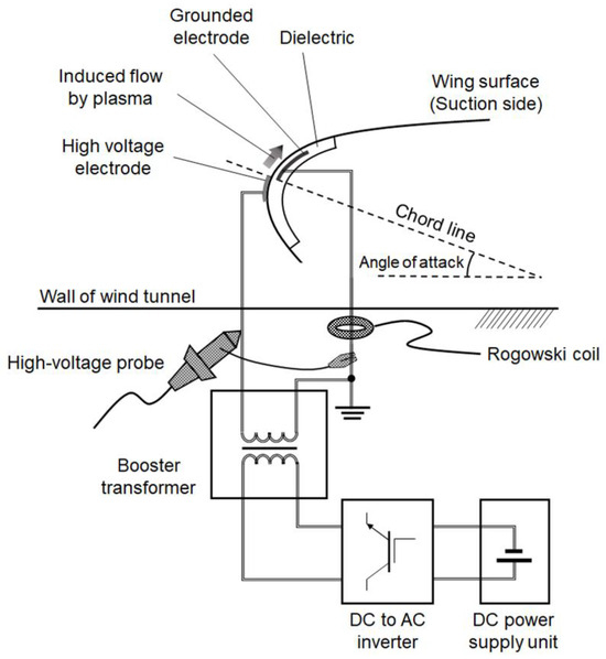 Figure 4 shows a schematic of the DBD-PA system, which consisted of a DBD-PA electrode and a power supply unit. For the DBD-PA electrode (Asahi Rubber Co., Ltd., Saitama, Japan), a silicone rubber dielectric (thickness = 0.4 mm) was sandwiched between a pair of titanium-film electrodes (thickness = 0.05 mm), i.e., a high-voltage electrode and grounded electrode. A high-voltage electrode was set on the pressure side of the wing model, and its upstream edge was along the leading edge. A grounded electrode was implanted into the dielectric and placed on the suction side. The dielectric was flush-mounted on the surface of the wing, and a high-voltage electrode was attached to the dielectric surface like a trip wire. The widths of the former and latter electrodes were 6 and 10 mm, respectively, and the electrodes overlapped by ~1 mm. In this configuration, the plasma-induced flow blew from the leading edge toward the suction side of the wing model.