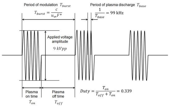 The power supply system consisted of a DC power unit, an AC inverter, and a high-voltage transformer. The output of the DC power unit was converted into a high-frequency AC waveform by the AC inverter, which was subsequently boosted by the transformer. The transformer output was connected to each titanium-film electrode. The amplitude of the applied voltage was 9 kVpp with a base frequency of 99 kHz. In addition, the applied voltage was modulated using a normalized burst frequency, , as illustrated in Figure 5. The values of in these experimental conditions were 0.1, 0.5, 1, 5, 10, 50, and 100. The function generator provided a control signal to determine the burst frequency and duty ratio of the inverter. The duty ratio is defined as a fraction of the duration of plasma activation in one period of the modulation waveform. This value was fixed at 34% throughout the experiments. The time-averaged input power was the same under all conditions because the input power was determined using the base frequency, the voltage applied to the electrodes, and the duty ratio. The waveform applied to the electrode was monitored using an oscilloscope, a high-voltage probe, and a current transformer; it was adjusted to the experimental conditions by controlling the output voltage of the DC power unit and signal of the function generator.