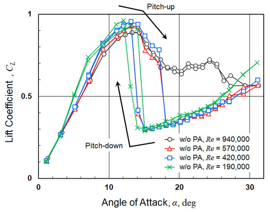 Strong hysteresis is also observed between the pitch-up and pitch-down motions around angles of attack of 13–18° for Re = 1.9 × 105–5.7 × 105 (Figure 6). The hysteresis observed in the curve is attributed to the bursting and reformation of a small laminar separation bubble near the leading edge of the wing, which depends on changes in the AoA. The position of the laminar separation bubble suggested by the shape of the distribution is indicated by the red arrow in Figure 7 for Re = 1.9 × 105– 5.7 × 105. The boundary layer separation occurs in the laminar state after the bursting of the laminar separation bubble in the aforementioned range of Re. In contrast, there is no hysteresis in the curve for Re = 9.4 × 105. These results suggest that the laminar separation bubble is very small or is not formed, and a turbulent transition of the boundary layer occurs further upstream around the leading edge than that under the other Re conditions. The separation points of the boundary layer determined from the particle image velocimetry (PIV) results are 0.07c, 0.065c, 0.065c, and 0.2c for Re = 1.9 × 105, 4.2 × 105, 5.7 × 105, and 9.4 × 105, respectively. This result also supports the consideration that the turbulent transition occurred closer to the leading edge at Re = 9.4 × 105 than that at the other Re values.