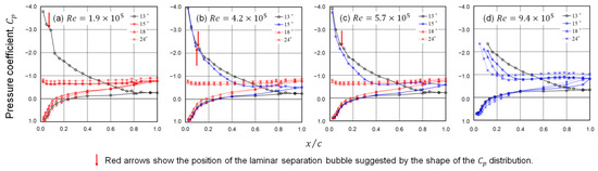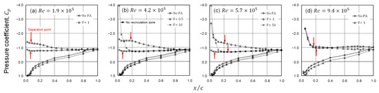 Figure 17 shows distributions on the wing surface under the same conditions as those shown in Figure 16. The red arrows in this figure denote the separation point of the boundary layer, i.e., the starting position of the recirculation region evaluated based on the PIV results. Without actuation, a flat distribution was observed in most areas on the suction side surface with a negative because the flow separates, and a separate area with recirculation is formed in the downstream region of the separation point on the suction side surface. The upstream edge of the flat region indicates the separation point; therefore, the flow is separated at the leading edge, as shown in Figure 17a Re = 1.9 × 105, (b) 4.2 × 105, and (c) 5.7 × 105, and the separation point moves downstream, as shown in Figure 17d 9.4 × 105. The change in the distribution with DBD-PA actuation was characterized by considering the relationship between the three indices shown in Figure 12, Figure 13 and Figure 14 and the distributions shown in Figure 17. Three trends of change correspond to the three phenomena described in the previous sections.