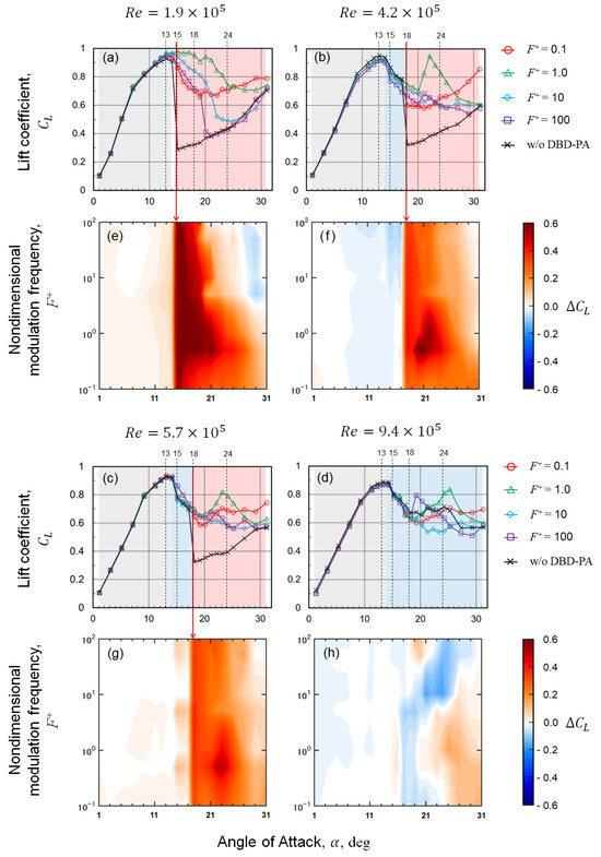 In Figure 8e–h, there is a negligible increase or decrease in regardless of the Re number, in the range of angles of attack corresponding to the gray range shown in Figure 8a–d. In the range of angles of attack corresponding to the blue range, is only slightly affected. For Re = 4.2 × 105 (Figure 8b,f), the increase in is negative at a high . For Re = 5.7 × 105 (Figure 8c,g), the increase in is slightly positive. Some peaks of increase were observed for every Re number condition. At Re = 5.7 × 105, these peaks are discrete with respect to . For Re = 9.4 × 105 (Figure 8d,h), the increase in depends on the AoA and , and the effect of DBD-PA actuation switches between positive and negative effects. At this Re number, for a 16–19° AoA, decreased under almost all conditions. However, for higher angles of attack, there are some conditions in which increases depending on . The most effective increase in was obtained in the range of the AoA corresponding to the red range in Figure 8a–d.