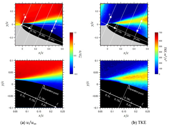 Figure 9a,b illustrate the distributions of the time-averaged x-component of the flow velocity, , and turbulent kinetic energy (TKE), respectively. These were calculated from 1000 image pairs of instantaneous velocity distributions measured using PIV. The conditions were = 1 with Re = 9.4 × 105. The direction of the main flow was from left to right, and the wing model is shown in these images up to 66% of the chord length. Figure 9a shows that the separation point of the boundary layer is estimated as 0.16c; furthermore, it shows that the wing surface is covered by a recirculation zone. A shear layer, shown as a change in contour color in Figure 9a, is formed between the main flow and the recirculation. This layer overlaps with a region with a large TKE value, as shown in Figure 9b. This TKE region starts immediately upstream of the separation point of the boundary layer. The shear layer thickness is shown in Figure 9a, which is defined as the distance between the position of u/u∞ = 0 and the outer edge of the shear layer at a certain chord position. The high-TKE regions in Figure 9b become wider with an increase in the distance from the separation point downstream.