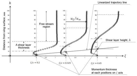 where and are the lift coefficient with and without DBD-PA actuation at a 24° AoA, respectively. A total of 28 data points were calculated considering all and Re number conditions in this study. (2) The ratio of the shear layer height : to calculate the ratio of the shear layer height, the axis was defined in the direction parallel to the chord line of the wing, and the axis was defined in the direction perpendicular to the axis, considering the origin of the coordinates at the leading edge of the wing, as shown in Figure 9a. Figure 10 shows the velocity profile of the -component along the axis parallel to this axis on the wing surface obtained at = 0.2, 0.325, and 0.45. The momentum thickness was calculated at several values, and the shear layer height was defined as the momentum thickness at = 0.45. The change in the momentum thickness with respect to the chord direction was approximately linear. = 0.45 was adopted because the position corresponding to = 0.45 provides the most accurate estimation of the momentum thickness, and the positions downstream from = 0.45 were not adopted because there exist conditions under which the freestream region was not included in the field of vision. The ratio of the shear layer height, , was defined as the value of the change in shear layer height due to DBD-PA actuation normalized by the height without actuation; this index is expressed by the following formula: