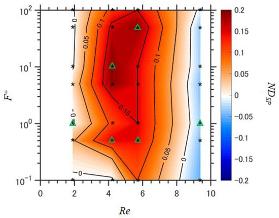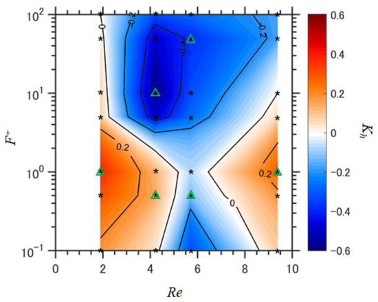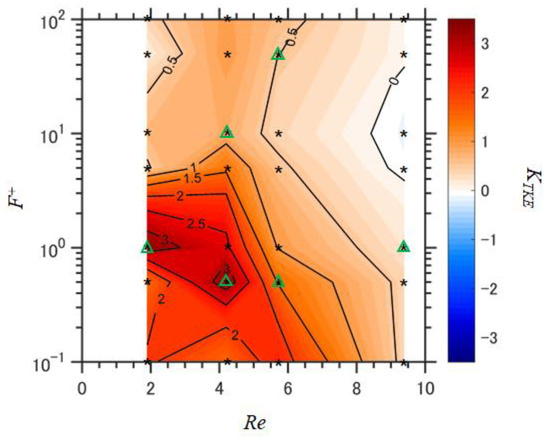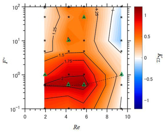 The discussion is based on the data for each of the four indices defined in the previous section, which are summarized in the color maps in Figure 11, Figure 12, Figure 13 and Figure 14. These figures, with the Re number on the x-axis and the normalized burst frequency, , of the plasma actuation on the y-axis, show the values of the indices defined by a color bar. The asterisks in Figure 11, Figure 12, Figure 13 and Figure 14 indicate the conditions for which data was obtained by PIV measurement, and the results of the conditions indicated by triangle marks are discussed in the next section. Figure 11 shows a contour map of the increase ratio by DBD-PA actuation, named the first index in the previous section, at a 24° AoA. The broken line in the figure connects the data points of the maximum value of each Re. Figure 11 illustrates the region where increases in clearly exist in the range of = 0.1 − 5.0 and their peak exists at = 0.5 or 1.0. Furthermore, the value shows a ridge at between 10 and 100 with Re between 4.2 × 105 and 5.7 × 105. The following discussion focuses on the phenomena that cause the characteristics of this index, as shown in Figure 11, based on the dependence of the other three indices on Re and .