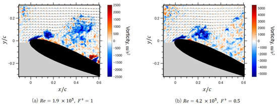 Furthermore, Figure 15a,b show the instantaneous vorticity fields and velocity vectors at Re = 1.9 × 105 with = 1 and at Re = 4.2 × 105 with = 0.5, respectively. Under both conditions, the maximum TKE increase ratio exhibits a high peak (Figure 12). Both flow fields are observed under DBD-PA actuation with a low , indicating that one or two vortices with a large negative vorticity are shed into the shear layer formed by the boundary layer separation near the leading edge. Both flow fields are frequently observed in the instantaneous PIV results under both conditions, which supports the consideration of high-energy vortices generated by DBD-PA actuation. The PIV data in this study had an insufficient time resolution; therefore, further studies using high-speed PIV or a phase-locked method are required to directly confirm from the PIV results that these vortices are generated synchronously by DBD-PA actuation. Considering the region where the third index is high, a comparison of Figure 11 and Figure 12 illustrates that the conditions of Re and with indices greater than 1.5 are relatively close in the bottom-left region in these figures. In contrast, from the same comparison at the region where the third index is less than 1.5, the first index increase found in the previous paragraph is not fully accounted for by the ridge of the third index, e.g., at Re = 4.2 × 105 with = 10, Re = 5.7 × 105 with = 50, and Re = 5.7 × 105 with = 0.5 and 1.0.