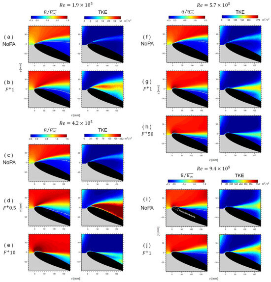 The other panels in Figure 16 present the typical results with the DBD-PA actuation; the characteristic phenomena can be observed in these figures. For example, Figure 16b presents the result at Re = 1.9 × 105 with = 1. The shear layer generated by the boundary layer separation at the leading edge shifted slightly toward the wing surface, and the shear layer thickness increased because of DBD-PA actuation. In addition, the TKE in the recirculation region increased significantly. Figure 16d presents the result at Re = 4.2 × 105 with = 0.5. The trends in change caused by actuation shown in this figure are similar to those in Figure 16b; however, they are emphasized further, i.e., the shear layer thickness increases significantly and the TKE shows a very high value occupying the entire recirculation region. Figure 16e presents the result obtained when Re = 4.2 × 105 with = 10, and the shear layer clearly shifts toward the wing surface. The recirculation zone cannot be observed in the average velocity distribution in the area between the wing surface and shear layer, and the TKE in the same area increases slightly. Furthermore, the position of the boundary layer separation moved downstream, and no boundary layer separation was observed at the leading edge. Figure 16g shows the results obtained when Re = 5.7 × 105 and = 1. The shear layer clearly shifted toward the wing surface, and the thickness increased slightly. The TKE in the area overlapping the shear layer also increased. The position of the boundary layer separation moved downstream from the leading edge. Figure 16h shows that the shear layer shifts further toward the wing surface than in Figure 16g and at Re = 5.7 × 105 with = 50, whereas the increase in TKE is smaller than that in Figure 16g. Similar to Figure 16e,g, the boundary layer separation at the leading edge was prevented. Figure 16j presents the result obtained for Re = 9.4 × 105 with = 1. The position of the shear layer moved slightly away from the wing surface with DBD-PA actuation in a different manner from the other conditions with a low Re number. The TKE of the shear layer increased, similar to that under the other conditions. The figure also indicates that the separation point of the boundary layer hardly changes, suggesting that DBD-PA has little effect on the enhancement of momentum exchange and separation suppression in the turbulent boundary layer in high-Reynolds-number conditions.