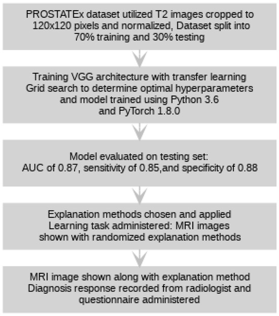 The PROSTATEx dataset [24] was utilized in this paper, which comprises 330 lesions from 204 subjects. The dataset includes T2 transverse, sagittal, and coronal MRI images, as well as ADC, BVAL, and KTRANS. In this section, the T2 images were preprocessed by cropping them to 120 × 120 pixels around the prostate centroid and then normalizing them. The dataset also provides lesion centroid coordinates and a label indicating whether the lesion is clinically significant. Recently, ground truth masks for the lesion and prostate zones [25] have been made available, and these were used during the learning phase (as illustrated in Figure 1) before the experiment to identify whether there is a lesion. The dataset was split into training and testing sets in a 70/30 ratio, with the training set used to train the model and the testing set used to assess performance and provide images for the paper cohort during the experiment. During the learning phase, MRI images with and without lesions were shown to the radiologists with randomized explanation methods. The classification was not provided to prevent biased results.