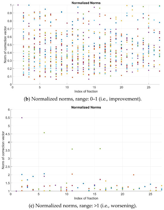 Normalized norms (N) for all patients and fractions—full range (a), range 0–1 (b) and range > 1 (c). Color dots represent the values corresponding to the different patients’ fractions.