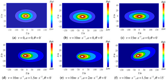 - Accelerated state. Figure 3d,e show a vehicle with a speed of accelerating along the axes with and accelerations, respectively. By comparison with Figure 3b, it can be found that the potential field of the vehicle presents an obvious forward-leaning phenomenon under accelerated motion. This means that the risk to the vehicle in front of the vehicle is significantly greater than that of the vehicle behind, so the required safety distance in front of the vehicle should be greater than that behind the vehicle. By comparing Figure 3d,e, it can be found that with the increase in acceleration, the degree of forward tilt of the vehicle potential field increases. It indicates that the greater the acceleration of the vehicle, the greater the risk to the front.