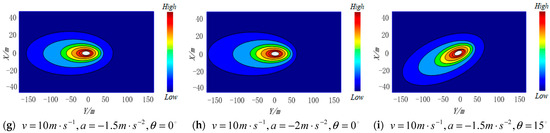 - Turning state. Figure 3f,i show the vehicle turning to the left while accelerating and decelerating, respectively. By comparing Figure 3e,h, it can be found that the vehicle potential field as a whole shifts with the steering angle when the vehicle is turning. Therefore, when studying lane changing, it is necessary to consider the influence of the steering angle on the vehicle potential field, which is also in line with the previous revision of vehicle potential field.