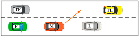 Since the motion state of the leading vehicle L in the current lane is basically not affected by the lane changing vehicle M, the leading vehicle L may perform uniform motion, accelerating motion, or decelerating motion. The initial lane changing speed and acceleration of vehicle M are set to be and , respectively, and the initial lane changing speed and acceleration of vehicle TF are set to be and , respectively. According to the generation mechanism of lane changing intention, it can be seen that vehicle M is subject to the repulsive force of the leading vehicle before it generates the lane changing intention, so this paper assumes that the initial lane changing speed relation is .