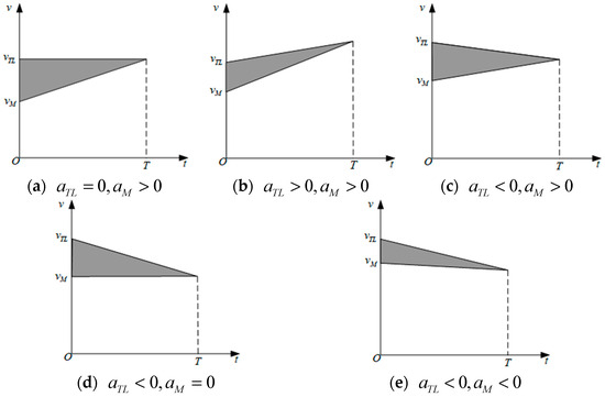 The safe critical time for lane changing represents the time it takes for lane changing vehicles and interacting vehicles to reach the same speed during lane changing. When the two cars reach the same speed, if there is no collision risk, there will be no collision later. In the actual lane changing process, the running state of the leading vehicle in the target lane is very little affected by the lane changing vehicle and can be ignored, so the state of vehicle TL generally does not change during the lane changing process. The initial lane changing speed and acceleration of vehicle M are set to be and , respectively, and the initial speed and acceleration of vehicle TL are set to be and , respectively. Based on the above assumptions, the safe critical time of vehicle M and vehicle TL under different moving states is plotted when , as shown in Figure 6. By analyzing the diagram, it can be found that if vehicle M completes the lane change under the condition of meeting the safe critical time of lane changing, the distance difference between the two vehicles with the same speed will no longer change. Therefore, the shaded part of the figure can be used to represent the distance difference between the two cars, which is , and the safe critical time for lane changing satisfies the formula , which is .