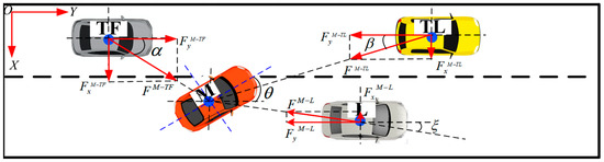The vehicle potential field force is a short-range repulsive force, which is used to prevent other vehicles from approaching to ensure safe driving. In general, the greater the vehicle potential, the stronger the potential field force. In the process of lane changing, vehicles are affected by multiple vehicle potentials, so it is necessary to determine the potential field force generated by each vehicle on the lane changing vehicle, and then judge whether the vehicle meets the conditions of safe lane changing. The lane changing diagram of vehicles as shown in Figure 9 is drawn, and the action potential of vehicle TL, vehicle TF, and vehicle L on lane changing vehicle M is analyzed respectively.