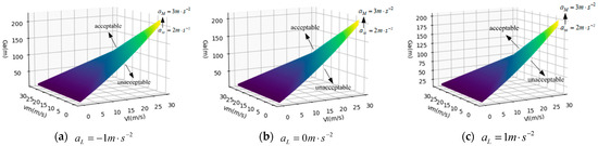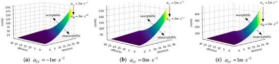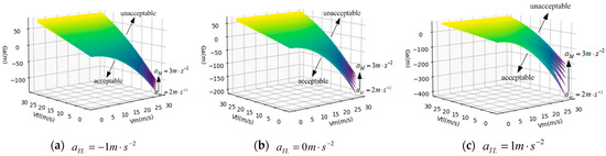 The simulation of the acceptable clearance of lane changing between vehicle M and vehicle TF is carried out, and the parameter settings are the same as above. Based on the above assumption , the change in acceptable lane clearance between vehicle M and vehicle TF when the target lane follows vehicle TF at the acceleration of , , and , respectively, is drawn, as shown in Figure 11.