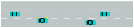 In order to verify that the vehicle interaction potential lane change model can effectively improve the speed of traffic flow and reduce the speed fluctuation of traffic flow, SUMO software (win64-1.11.0) was used to conduct simulation experiments. The experiment scene was set as a 2 km long one-way, three-lane road with a speed limit of 60 km/h. This was the simulation interface of the lane changing experiment, as shown in the Figure 13. After the vehicle generates the intention of lane changing, it will turn on the left turn signal to signal, which well reflects the environmental state of the lane changing vehicle in the model.