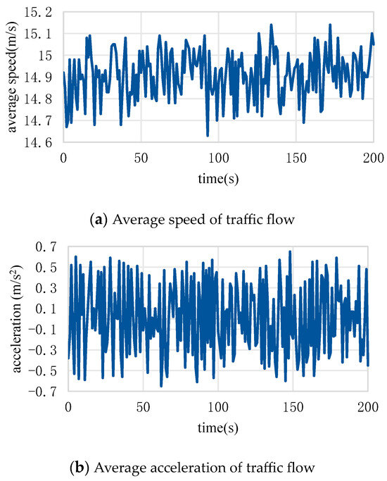 The traffic flow operating parameters output by the experiment were graphically analyzed, as shown in Figure 14, reflecting the changes of the average speed and average acceleration of the traffic flow. In the intelligent network environment, the vehicle can obtain the operating parameters of the surrounding vehicles in real time, and then judge the environment in which it is driving to achieve uninterrupted speed adjustment. Figure 14a reflects the change in the average speed of the traffic flow. It can be seen from the figure that the traffic flow on the whole is traveling at a relatively ideal speed, and the average speed fluctuates at , which is relatively gentle. Figure 14b reflects the average acceleration of traffic flow. It can be seen from the figure that the overall average acceleration is distributed within the range of , and the acceleration state is obviously more than the deceleration state, which is also the reason why the average speed of traffic flow is relatively ideal.