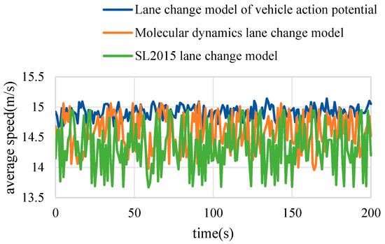 In order to better verify the effectiveness of the vehicle action potential lane changing model, a set of comparison experiments between the vehicle action potential lane changing model, molecular dynamics lane changing model, and SL2015 lane changing model are designed. Among them, SL2015 is a built-in model in SUMO software, which can well simulate the lane changing behavior of vehicles. The molecular dynamics lane changing model is based on the Lennard-Jones 6–12 potential function. The vehicle action potential proposed in this study is modified on the basis of the Lennard-Jones molecular interaction potential, and the comparison of the three parameters has a certain significance.
