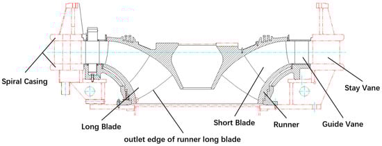 In this paper, the Francis turbine of a high-head hydropower unit was taken as the research object, and the establishment of a geometric model is the basis of simulation work. The sectional view of the high-head turbine is shown in Figure 1. The model parameters are shown in Table 1. The runner diameter is 2.35 m, the distribution circle diameter of guide vane is 2.65 m, the guide vane height is 2.88 m, and the head is 282 m; there are 14 fixed guide vanes, 28 movable guide vanes, 15 long blades and 15 short blades of the runner, and the rated speed is 500 rad/min. Each component needs to be assembled after 3D modeling separately.