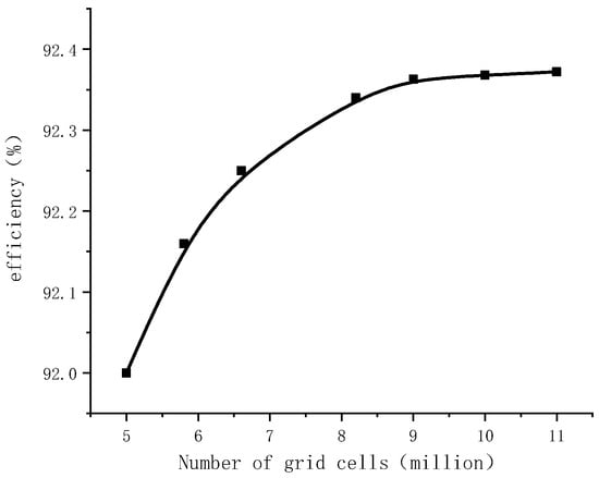 It can be seen in Figure 3 that when the number of grids is less than 8.5 million, the unit efficiency increases as the number of grids increases. When the number of grids is greater than 9 million, the efficiency change of the unit tends to be flat as the number of grids increases. Therefore, considering the constraints of limited computing resources, the number of grids is determined to be 9.02 million to ensure the accuracy of the calculations. The grid quality of each fluid component is shown in Table 2. The grid quality value of each flow component is greater than 0.2, so the grid quality meets the requirements.