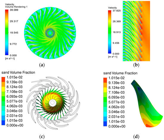 Velocity field and sediment volume fraction distribution cloud map of the turbine runner internal flow. (a) Turbine runner velocity field cloud map; (b) velocity distribution cloud map of the turbine runner blades; (c) sediment volume fraction on the turbine runner blades; (d) sediment volume fraction on the back side of the blade.