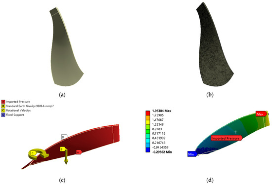 Turbine runner blade model and constraint loads. (a) Turbine runner blade model; (b) turbine runner blade mesh model; (c) imposition of constraints; (d) dynamic pressure data transfer.