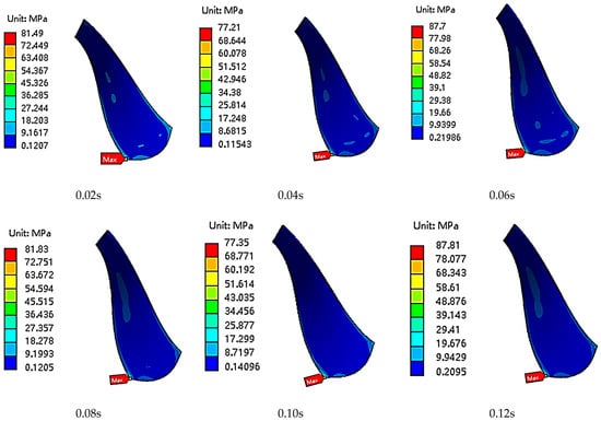 Utilizing the fluctuating water pressure load data on the blade surface at various time points, derived from the transient flow field calculation of a Francis turbine’s entire passage, a transient dynamic stress mechanical analysis of the blade is performed. This analysis employs a unidirectional fluid–structure coupling method to couple the blade surface, yielding the equivalent stress–time history data on the blade surface at different times for various degrees of wear. Figure 7 presents the equivalent stress cloud diagrams of the blade at various instances throughout the rotation cycle, under the wear condition denoted as T0.