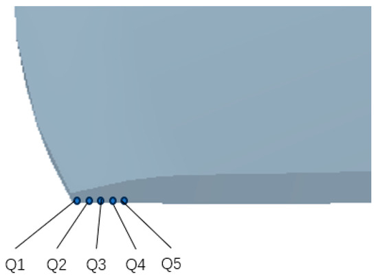 To thoroughly understand the variation in equivalent stress within the critical areas of the runner blade, stress monitoring points were established along the worn portion of the blade’s tail at locations of maximum stress for each degree of wear. These points are designated as Q1, Q2, Q3, Q4, and Q5. The positioning of the stress probes is illustrated in Figure 8. Dynamic stress data for each monitoring point over a complete cycle and across various degrees of wear were extracted and are presented in Table 4.
