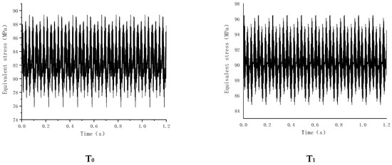 The von Mises equivalent stress–time history data for each monitoring point on the runner blade, under various degrees of wear, were extracted for a period of 1.2 s. Figure 9 illustrates the stress–time history at monitoring point Q1 for the same duration under wear degrees T0 and T1.