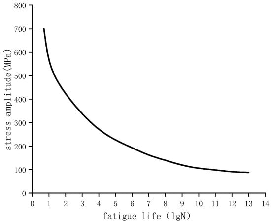 As the stress–time history data from blade monitoring points at various wear times, derived from transient dynamics calculations, do not exhibit cyclic symmetry and are thus unsuitable for direct calculation of runner blade fatigue damage, this paper employs the rain-flow counting method to construct a load spectrum from the stress–time history data corresponding to different degrees of wear. This paper classifies the compiled stress amplitude data obtained under various degrees of wear and counts the number of cycles associated with each stress amplitude. Since the statistical stress amplitude is not directly applicable for calculating the fatigue damage of the runner blade across different wear degrees, it requires correction. The material chosen for the turbine runner in this study is ZG0Cr13Ni5MO. Its yield strength is 495 MPa, and the tensile strength is 735 MPa. The corrected stress amplitude is then compared with the fatigue life curve (S-N curve) of this material [22], as seen in Figure 10. With this comparison, the fatigue cycles for blade monitoring points under different stress amplitudes and two levels of wear can be directly ascertained. Since the wear on runner blades predominantly occurs during the flood season, this study adopts a time scale of 2 months between different wear levels of the blades. Given that the rotation cycle of the runner is 0.12 s, it is possible to determine the total number of cycles and the fatigue damage at each stress amplitude for the blade’s monitoring points under various wear conditions through a proportional relationship. Subsequently, the cumulative damage theory was applied to calculate the overall fatigue damage to the blade across different wear conditions, with the findings presented in Table 5.