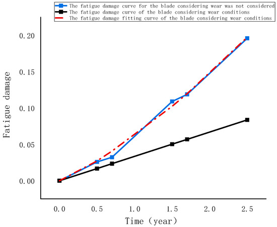 From the table comparison, it is evident that considering blade wear results in a higher total fatigue damage than when wear is not considered. Additionally, the damage growth rate at the blade’s maximum stress point shows an increasing trend with wear. To better understand and compare these changes, a curve illustrating the pressure fatigue damage over time, with and without accounting for wear, was plotted, as seen in Figure 12.