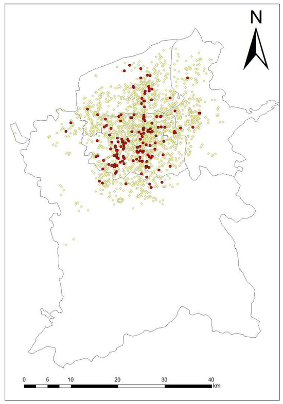The study area is the center city of Xi’an, Shannxi province. Xi’an land space overall planning (2021–2035) (http://zygh.xa.gov.cn/web_files/zygh/file/2022/11/08/202211081852155156437.pdf, accessed on 4 April 2024) defined the central urban area of Xi’an is about 766 square kilometers, including seven districts. The total number of parking lots is 2506, of which 216 have mechanical parking spaces. In order to explore the influence of built environment factors on mechanical parking spaces and provide a theoretical basis for the construction of mechanical parking lots, this study selected the proportion of the mechanical parking spaces ratio as the dependent variable, and the range of independent variables is [0, 1]. A value of 0 means that all parking spaces are ordinary parking spaces, 0.5 indicates that mechanical parking spaces account for 50% of the total parking spaces, and 1 indicates that all parking spaces are mechanical parking spaces. The distribution of parking lots (yellow dots) and parking lots including mechanical parking spaces (red dots) in the center city of Xi’an are shown in Figure 1.