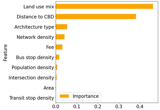 The relative importance of the variables obtained in Python is shown in Figure 2. The relative importance of a variable is the predicted contribution of an independent variable to the dependent variable relative to other independent variables. The higher the relative importance, the greater its effect on the dependent variable. Land use mix (46.2%) and distance to CBD (38.2%) (Bell Tower in Xi’an) are two of the most important variables affecting the mechanical parking spaces ratio. Followed by the variables architecture type (5.4%), network density (4.2%), and fee (3.2%). Chen et al. [29] proposed that proximity to the city center is the second most important factor and that intersection density has the lowest impact on parking demand, which is consistent with our study.
