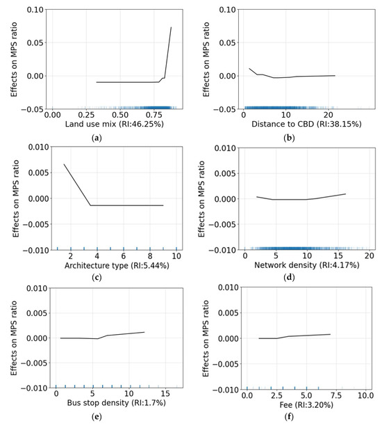 The ALE plots show a non-linear and threshold effect of factors on the MPS ratio. The blue line indicates the value of the independent variable. The denser the blue line, the higher the frequency of that value. Figure 3a shows that the land use mix is positively associated with the MPS ratio. When the land use mix is less than 0.83, there is no obvious variation in the MPS ratio. While it exceeds 0.83, its effects are faced with a sharp increase. The distance to CBD is negatively associated with the MPS ratio, as shown in Figure 3b. It shows a threshold which is about 7 km. When the MPS ratio is less than 7 km, it faces a large slope. When it exceeds 7 km, the influence is minimal. The reason is that the land resources in the city center are scarce, and mechanical parking spaces are needed to improve the level of land use, meet parking demand, and improve turnover efficiency. Different architecture types have different effects on the MPS ratio (Figure 3c). The hotel, public, and temporary areas need more mechanical parking spaces. The network density has an extreme effect (Figure 3d). The higher or lower the density, the greater the impact on the parking rate. The road network in the city center is dense and the shortage of land requires mechanical parking spaces. The road network outside the suburbs is sparse, and some large attractions, such as parks or commercial centers, have a high demand for parking. See from Figure 3e, the influence of bus stops on MPS ratios is positive and the threshold is 5 units/km2. The higher the density, the higher the ratio, mainly because the higher the density, the more likely it is to be in the city center, and, therefore, the higher the requirement for the ratio. See from Figure 3f, the influence of fees on MPS ratios is positive and the threshold is 2.5 yuan/h. The higher the cost, the higher the rate. The main reason is that, on the one hand, the parking fee in the city center is high, and it is more likely to build mechanical parking spaces. On the other hand, the cost of a mechanical parking lot is higher than that of an ordinary parking lot. The effects of population density, intersection density, area and transit stop density are close to zero.