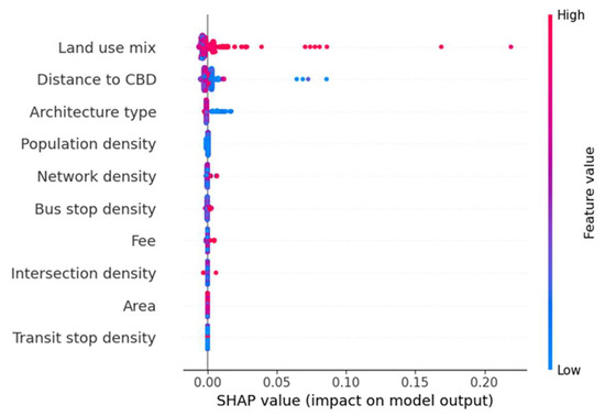 The SHAP tree explainer is used to explain the model globally and locally. The order of the influence of the SHAP value on variables is given from large to small in Figure 4. It is almost the same as the importance of the variables obtained from the GBDT simulation. Land use mix, distance to CBD, and architecture type are three variables with large influence and have the best global interpretability to MPS ratio.