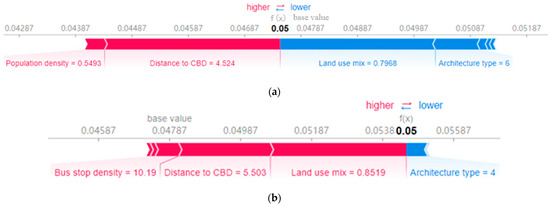 The local interpretability of the model shows the prediction contribution of each parking lot buffer with a different spatial coordinate. Two buffers are randomly selected and show the SHAP value of each variable, which is shown in Figure 5. The base value is the same (0.04787), which is the average of all samples. The red bar indicates the positive influence and the blue color means the negative influence. As shown in Figure 5a, the variables with positive SHAP values are population density and distance to CBD. The remaining variables have a negative influence. The total SHAP value is 0.05, which is higher than the mean value. Figure 5b shows another sample of which variables have different influences. These two samples show that the local interpretability of variables is different from the global interpretability, and the local interpretability varies across buffers.