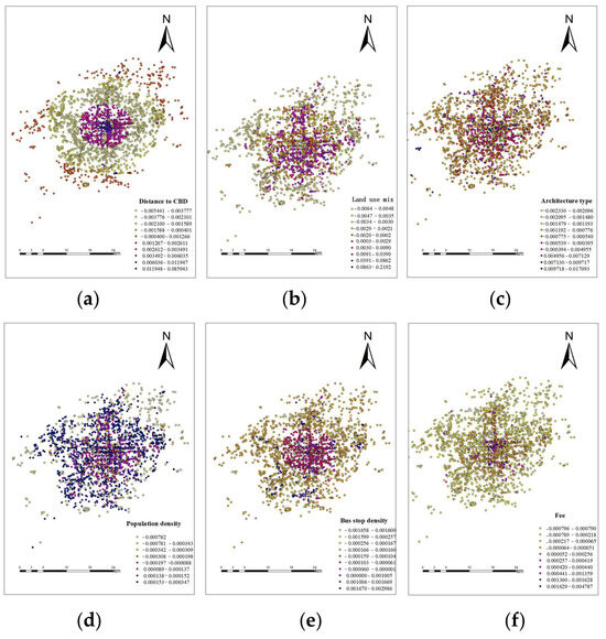 Contribution of different variables obtained from SHAP values over space: (a) distance to CBD; (b) land use mix; (c) architecture type; (d) population density; (e) bus stop density; (f) fee.