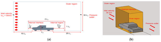 A no-slip condition was set for the wall in contact with the fluid, and the external flow area was set to 30 times the vehicle length to minimize the effect of the fully developed area on the flow around the vehicle. The interface between the outer and inner regions was designed to allow the fluid to flow by imposing an internal interface condition. To obtain accurate results while minimizing the number of grid cells used for numerical analysis, the outer and inner regions were separately constructed under different grid conditions. The grid size of the outer region was set to 150 mm, that of the inner region was set to 3 mm, and that of the vehicle was set to 2 mm.