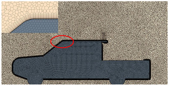Mesh structure of the middle section of a pickup truck. (The red circle is the area where the grid is enlarged).