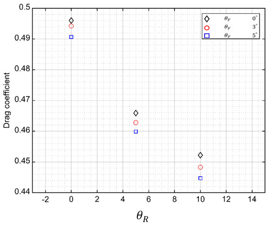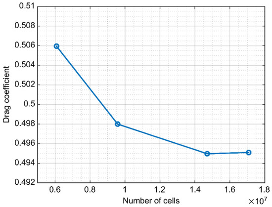 Figure 4 shows the results of the grid-independence test, in which the convergence of the drag coefficient was examined according to the number of grid cells to determine the optimal number of grid cells for the numerical analysis. The drag coefficient distribution was examined for the geometry of the base model when the number of grid cells was increased from 6 million to 17 million. The drag coefficient tended to decrease under the second grid condition and almost converged under the third grid condition. From the fourth condition onward, the computation time increased due to the unnecessarily large number of grid cells. Therefore, a numerical analysis was conducted for all models using the third grid condition (15 million cells).